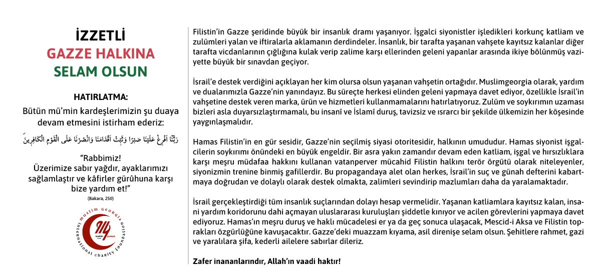 Muslimgeorgia olarak, yardım ve dualarımızla Gazze’nin yanındayız. Bu süreçte herkesi